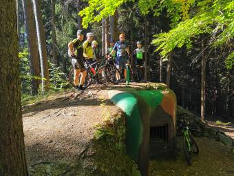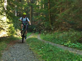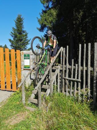 Midlander nás za chvíli dojel a potěšil nás sdělením, jak bylo na Větrném krásně a kam až bylo vidět. To nás utvrdilo v tom, že už toho bylo pro dnešek dost a zážitkového stoupání po zelené lesem ze Skříněřova masivem Libína se rádi vzdáme. Vzali jsme to tedy nejkratší, ale krásnou cestou přes Blažejovice a dál po žluté mezi kravami (poučení: nevěř kravinci, co vypadá, že je vyschlý) zpět k Jitřence. Cestou se několika borcům rozležela ta midlanderova tisícovka v hlavě a rozhodli se, že ještě v závěru dne pokoří Libín (1093m). To nenechalo chladným ani midlandera a rozhodl se svůj náskok v počtu tisícovek udržet a jet taky. Na Libín už to byla vysloveně rychlovka, nahoře důkazové foto od ochotného pěšáka a zpět, jedna část party po asfaltu, druhá sjezdem po modré na Libínské sedlo a z něj dál do Albrechtovic, závěr opět asfalt.