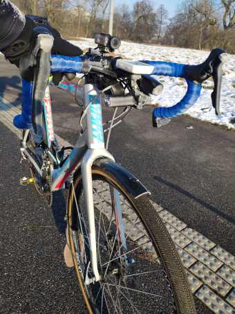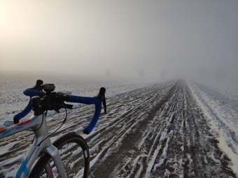 Krátká vyjížďka za bráchou do Koněpůlek. V Mechově mlha, mezi městy hustší a od Kuňky slunce. Byl jsem rád za Varii vzadu. Přední lampu jsem pravidelně oškrabával od námrazy svítíc na maximální výkon.