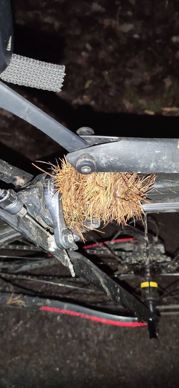 Tak si tak po ránu jedu do prudšího kopečka, kde se stoupání postupně zvyšuje a asi v půlce jsem zjistil, že nemám dost lehké převody. Takže ze sedla, funím, nadávám na ženu, že mě vykrmila, jak vánoční husu, wattmetr leze do čtyřciferných čísel a když se přehoupnu přes vrchol a ono to stejně nejede, tak začnu hledat důvod. A on to byl hajzlík modřín :-)