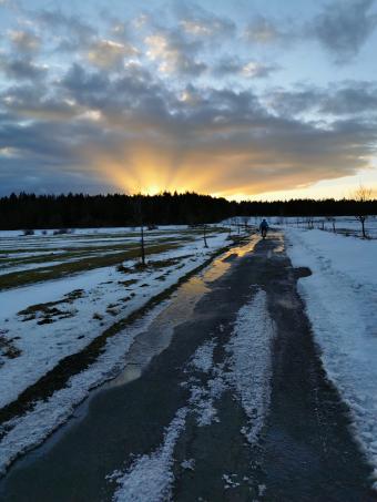 Takže zase jeden z mých sólo víkendů, kdy mě rodina vypustila do lesů, abych si trochu zničila tělo a bylo pak doma se mnou k vydržení :-) Tentokrát byla mou základnou Buková u Věšína na samém úpatí brdských kopců. Nalomena milovníky bílé stopy, vypůjčila jsem si dokonce běžky, náčiní, na kterém jsem nestála 35 let. Což myslím hovoří za vše, že. Naštěstí v prodejně sportovních potřeb, kde půjčovna funguje, znají mé sebedestrukční sklony a proto mi vybrali běžky alá Zátopek, u nichž nehrozilo, že by se mohly příliš rozvášnit. Zpočátku jsem zkoušela chybějící techniku a odpor lyží nahradit hrubou silou. To celkem fungovalo, dokud nějaká síla byla. Posléze jsem přešla do pokorného šoupání až plazení, navíc po krajích silniček, značených jako cyklostezky, na nichž silničáři opravdu štěrkem nešetřili. Skluznice tu a tam kvílely a žehraly na krutý osud, ale se mnou se taky nikdo nemazlil, tak co. Úplně vyřízená jsem se se západem slunce a ve slušném vichru doplazila na privát, kde jsem strávila asi deset minut v naprosté nehybnosti na zemi na koberci a představovala si vítězný pocit běžce, který vyčerpaný ale šťastný dokončil ultramaraton v Death Valley. Po vyzutí bot jsem navíc zjistila, že zdánlivě lehce tlačící běžkařské boty mi vybarvily dva prsty na noze do pěkného černofialového odstínu. Regenerace do nedělního rána ale proběhla vcelku úspěšně, v prstech přestalo cukat a navíc díky oteplení a silnému větru přes noc ubylo dost sněhu. Čili neděle bude čas kola a příjemných cest krytých posypem, okolo kterých jsem se v sobotu plížila s jednou lyží trvale v příkopu. Jsem si tedy myslela…