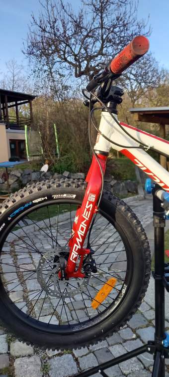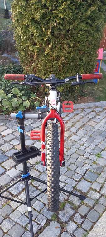 Další v řadě kladiv na čarodejnice pro mladého pána. Kolo jsme pořídili už jeté ale ve velmi pěkné stavu a přiznalo pár drobných změn, pedály gripy brzdy – ty jsou hydrauliky místo nmechanických. Mladej je spokojene a jezdí se mu zatím dobře. Široký pneu v terénu dobře fungujou jako tlumení – nafoukáno cca 1ATM.