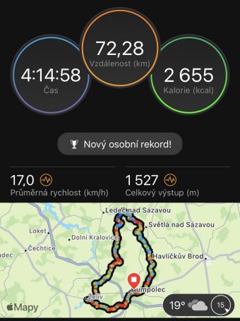 V pátek bylo pěkně a tak jsem kolem desáté vyrazil směr přehrada. V Želivě jsem to otočil po zelené na Kaliště, odtud Melechov, Stvořidla, Vilémovice, Pavlov… Na konci tradiční výjezd Orlíku a měl jsem toho tak akorát. Furt hledám polohu, kde mne nebudou trápit třísla, proto taková průměrná rychlost. Nohy můžou, plíce můžou, ale bolí to.