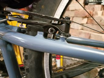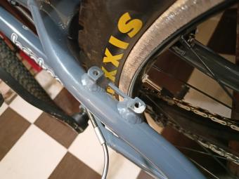 Po roce adaptéry Onza (redukce z Maguráckého 4-bolt na klasické Véčko) opět praskly… Už se ani nedaj skoro nikde sehnat a přestaly mě bavit, jak jsou poddimenzované. Rám bohužel nemá navářku na kotouč, takže musím použít ráfkovou brzdu. Klasickou Maguru HS33 nechci, najezdil jsem se s tím několik let, moc mi nevyhovuje „lenivost“ páky a její vetší odpor, prsty mám zesláblé.:-) Navíc věčná pakárna s odvzdušňováním, úniky oleje,… Taky jsem si prostě oblíbil tu mechanickou jednoduchost Véčka, jednou za rok preventivně vyměním lanko a mám klid. Nějakou další redukci jsem nechtěl bastlit, takže jsem na férovku převrtal spodní díry v brzdových navářkách a přeřezal závit z původního M5 na M8. Moc materiálu okolo nezbylo, ale snad to bude stačit.:-) Rám je z alu 7005-T6. Kámoš se soustruhem (díky Oldo! :-)) mi upravil brzdové pivoty dle potřeby, samotnej pivot je zašroubovanej 11mm hluboko, pod úrovní sváru, tak by to mohlo snad nějakej čas vydržet.:-D Všechno na sebe přesně dosedá, brzda sedí co nejníže na navářkách co jen šlo, aby se navářky co nejméně zatěžovaly páčením při brždění. Brzdný účinek je oproti předchozímu použití s redukcí vyšší, protože celá brzda nyní sedí výše, špalky jsou blíže k čepu a tudíž páka na ráfek je větší… Prsty si odpočinou! :-D