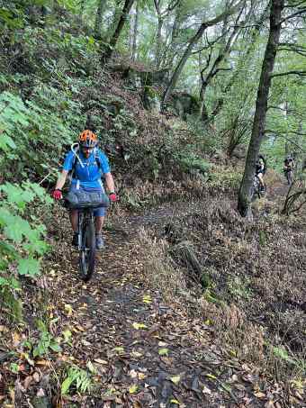 Vytoužený odpočinek nastal v Čeřeništi u kostela, na travnatém plácku pod lípou, na který často nostalgicky vzpomínal kotwík, když jsme se později zanořili do bahýnka pěšin vinoucích se zdejšími listnatými lesy. Tam jsme měli zakempit, tiše pro sebe hořekoval, píchajíc klacejčkem do kaolínu v kufru tretry. Zatímco se tedy pod lípou vařila káva v hubertově konvičce, Aleš zoufale překlikával v mobilu mezi zamýšlenou trasou a meteoradarem a lehce nenávistně na nás zahlížel, jak je nám všechno egál a furt jíme a pijeme. Nakonec nás přeci jen zvedl, aby mu o kus dál na panelce zasadil další zásah Hubert, který tam parádně vymetl hluboké bahno mezi panely a kupodivu bez následků se projel pár metrů po betonu obličejem a vším, co tak při jízdě po betonu po obličeji následuje. Zde už Aleš vydal embargo na výdej univerzálního kofiho všeléku na každou potíž a později se vyjádřil, že zde s láskou vzpomněl na své děti, které by mohl v obdobné situaci aspoň pěkně proplesknout. Před lesním sjezdem ke hradu Střekov nás důrazně upozornil, že v lese rostou stromy, že na zemi je bláto a že jsme částečně nesvéprávní, což zafungovalo, pud sebezáchovy byl obnoven a další tlama byla až moje na parkovišti u hradu, kde mi na gumách obalených bahnem nevyšla vítězná baletní piruetka. Později jsem si pak všimla, že Aleš zamyšleně hledí směrem k šibenici na Střekovském nádvoří..