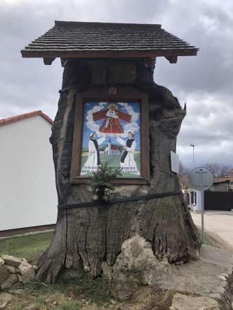 Opalice-torzo památného dubu s obrazem znázorňujícím „podivuhodné zachránění zlatokorunských mnichů na přímluvu Panny Marie Kájovské“