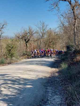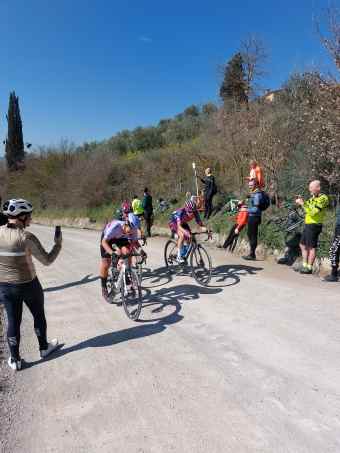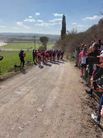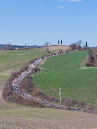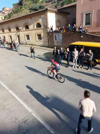 Sobota je první kompletně slunečný den. S tím je spojena i jasná noc a ráno teplota kolem 0°C, na odpoledne předpověď 15°C. Mám plám potkat na trase 2× holky a 3× profíky. Time table je k dispozici na webu závodu, tak udělat plán na celý den je snadné. V 9:15 vyrážím. Cca hodinu před pelotonem na silnici normální provoz, potom jen ve směru závodu a ani na kole mě policat nepustí do protisměru. Nevadí, jedu po směru na místo, kde je dobrý výhled. Cca 15 min před pelotonem ještě spousta cyklistů a různých aut na trati, zhruba 10 min před čelem auto zavírá trať. Projede balík, doprovodná auta, hned za ním auto pořadatelů a trať je volná, můžeme jet dál. Vzhledem ke klikatosti trasy není problém balík stihnout několikrát. Celkem vtipné je to blízko cíli v Sieně, to už je balík hodně roztrhaný na malé skupinky. Projede Tom, pak skupinka, pak větší skupinka a většina diváků to balí a odchází, i v protisměru. Do toho postupně jezdí další izolované skupinky závodníků a jejich doprovodná auta. Někde tam vidím Sagana. Celkem zmatek. Ani se nepamatuji, jestli jsem viděl auto zavírající závod. Mizím na ubytko pustit si záznam.