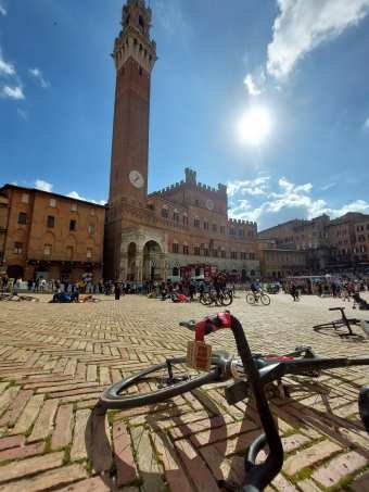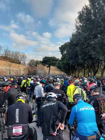 Neděle je můj závod. Ráno auta omrzlá, v 7 hod. vyrážím z ubytka, start v 8. Jdu do koridoru 2500–3500, budu někde v půlce balíku. V 8 start pro první vlnu, v 8:10 se dávám do pohybu. Výjezd z koridoru je trochu zaškrcený což je dobře, protože na širokou silnici se trousíme po jednotlivcích a nejsme žádný kompaktní balík. Čas se měří od projetí startovní čárou. Prvních pár km je z kopce a díky rozředění to sjíždíme velmi bezpečně. Pak se na silnici udělali cca 3 koridory, vpravo se jede pomalu, uprostřed rychleji a já frčím vlevo. Tempo je fajn, jen zřídka nás míjí výrazně rychlejší skupinky. Nikdo neprasí a jede se fakt bezpečně, asi nejbezpečnější silniční závod, co jsem kdy jel. Na šotolinových sektorech si dávám odstup a jedu si svou stopu. Vidím jen minium defektů. Na konci každého sektoru stojí modrá Shimano Toyota, co dělala neutrální auto profíkům a dělá servis. Je i dost motorkářů co nabízí servis nebo pomoc. To z českých závodů neznám. Na trati 3 občerstvovačky, všeho dostatek, opět lepší než na CZ akcích. Trochu zklamání přichází ke konci trasy, kde se spojuje krátká a dlouhá, to je zhruba 20 km do cíle. Je tam občerstvovačka, beru vodu a míjí nás auto, které končí plnou uzávěru trati. Jede cca hodinu za čelem závodu. Takže zbytek je s autama, ale hlavně slabšími kusy z krátké, jak na kole pro život. Na křižovatkách jsou pořád policajti, máme přednost, ale už to není ono, naštěstí ulice v Siena v závěrečném sjezdu jsou pořád uzavřené. To si užívám, ujíždím zbytku skupinky a výjezd na náměstí si dávám sám.