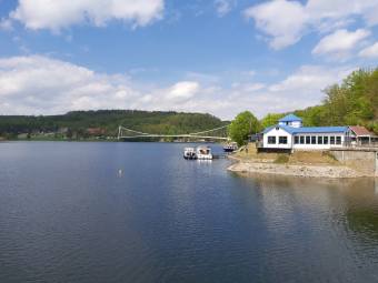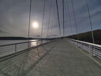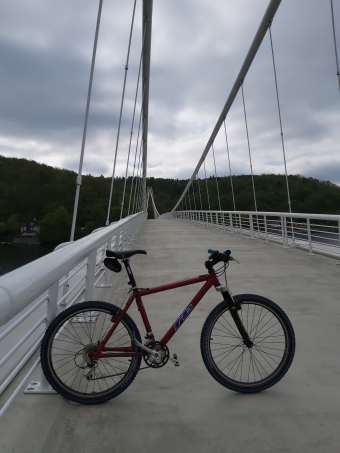 Na mostu jezdí vláček s lenochama, no problémo, ale cyklista musí sesednout. Já vždy krokem projel, přeci nebudu poškozovat povrch mostu ocelovými SPD kufry.