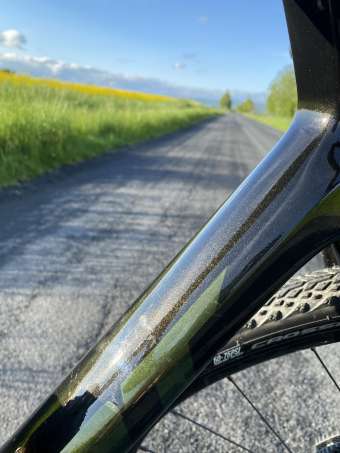 Ještě drobnost: samozřejmě bezduše, zatím bez tmelu : ) Až si budu jistý obutím tak doplním. Zvažoval jsem Vittoria terreno dry 40, ale na plánovaný gravel závod jsem nemohl, takže … na asfalt jsou aktuální plaste super. Ideální tlak ještě hledám, aktuálně cca 2,8 – 3,0 bar. V červnu bych rád nějaký dlouhý výlet. Sedlo je křeslo : )