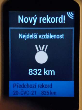 V Hradci Králové mi chybí 15km na překonání osobního rekordu. Přes únavu, blízkost sprchy a postele si natahuji cestu přes lesní okruh. Vyplatilo se, v cíli cinklo 832km.