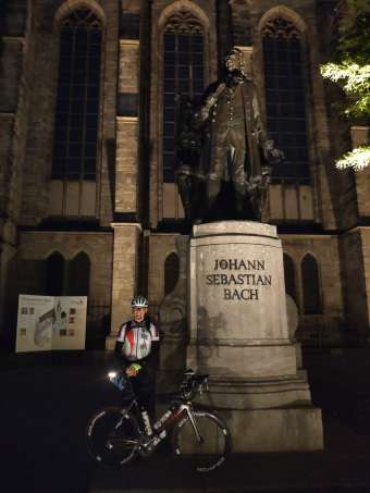 Je krásně, vítr postupně slábne, kolem mne se střídají lesy, louky a zlatá pole. Přede mnou je vidět rovina a v dáli chladící věže elektrárny u Lipska. Připadá mi to jako kousek, ale ony jsou ty věže velké. Do města přijíždím se západem slunce, tak brzy jsem tu ještě nebyl. Ve městě je živo, na rozdíl od nočních hodin, na které jsem zvyklý. V centru města slyším hudebníka na ulici, jak na housle hraje árii ze slavné Bachovy Svity č.3 , hezké a potěšilo. Kostel Sv. Tomáše nalézám ve 22:30. Pořizuji pár fotek a usedám na schody, dávám si večeři. U slavné skladatelovy sochy se střídají návštěvníci a fotí se. Nejsem sám, kdo sem přijíždí nasát atmosféru tohoto magického místa.