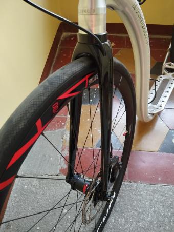 Tahle věc je sestavena na základě mých zkušeností se „silničním“ koloběhem. Ten se provozuje i na pěkně debilních cestách, takže je to trochu „gravel“ řekněme. Zásadní byla pevná osa vpředu. Jednak zvyšuje tuhost celku, druhak je znát i v komfortu. No a hlavně jsem na to měl kolo .Jasná byla karbonová vidlice, bohužel v žádoucí délce (kvůli výšce nášlapu) není snadné pořídit, takže tam šly dvě hliníkové redukce. Není to suprideál, ale funguje to. Deorka brzda stačí, ale na tomhle základním kotouči trochu vadne, měnil bych za Galfera. Vpředu 30 mm plášť Vittoria Rubino možná moc fat, 28 by stačilo, člověka tlumí nohy. Vzadu tradičně jezdivej balon, co redukuje smyk a zvyšuje pohodlí. Stačil by taky menší objem, ale na menším obvodu malého kola není hmotnost tak zásadní a Marathon umí hezky lítat i tlustej.