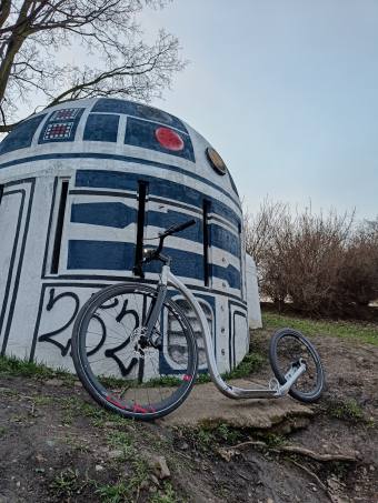 Kolobka byla vyšlechtěna pro delší expedice, čemuž odpovídá delší šlahoun brzdy (aby se dobře vešla bikepackingová brašna) a vzpřímenější představec. Po několika měsících ale zůstává využita jen pro občasný fitness švihy po kundodromu na pivo. Měla excelovat na Přejezdu republiky, ten jsem vzdal po 100km , kdy mě sejmula nevolnost a upal…a psychika. Holt, všechno je v prdeli. :)