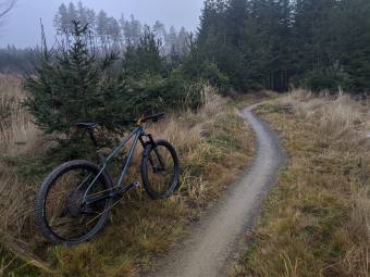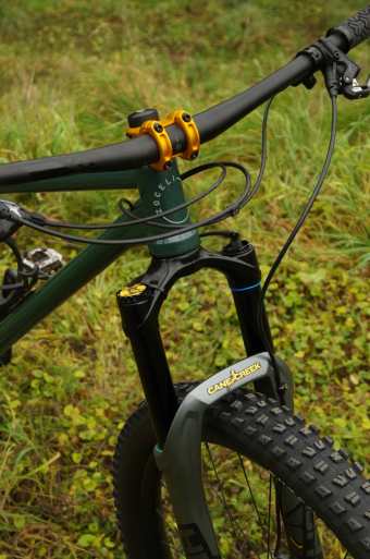 Rám je předprodukční, takže nemá stejnou geometrii jako později na stránkách Zoceli prodávaný „sériový“ rám Natvrdo. S nastavením vidlice na 140 mm mi úhloměr telefonu ukazuje hlavovej úhel asi 65,5 stupně, efektivní sedlovej bude bez sagu přes 75. Po výměně představce se geo od Trance 29 (oboje v sagu) vlastně zas tak neliší, na Zoceli jsem v sedle trochu víc nataženej.