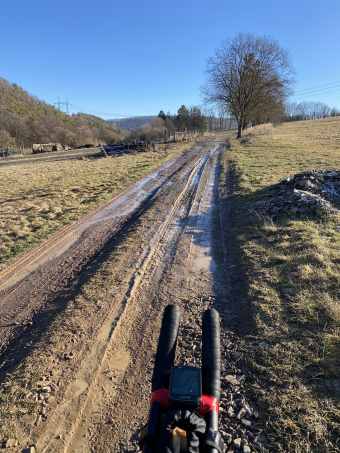 Překvapilo, že nízké teploty vydržely až do 10h ráno, takže prvních 6h jízdy bylo v cca –7. Pak se začalo oteplovat a od poledne přišla sravda v podobně bahnění na slunci a klouzání na ledu ve stínech.