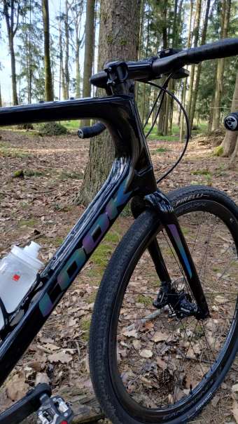 Kvůli mytí jsem chtěl lesklý povrch místo moderní matný barvy. Trochu jsem měl obavy z petrolejové barvy polepů, ale v reálu je méně nápadná než na stránkách Looku Celek je tuhý a příjemně obratný. Chtěl jsem od samého začátku něco méně běžného než je Specialized nebo Trek na Force, případně další Canyon (možná kdyby byl nový Grail na Campě :-).