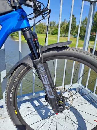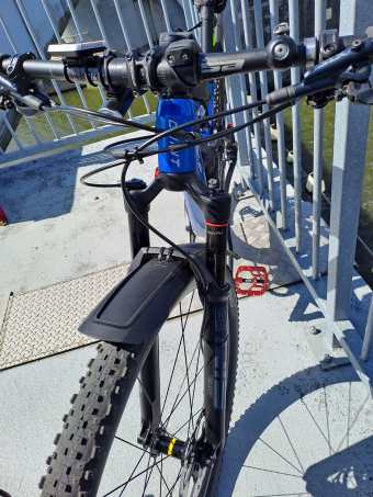 Blatní přední je Mucky Nuck – Mudgard krátký. a pláště jsem nedávno měnil za SCHWALBE RAPID ROB šířka 2,25, protože jsem měl fakt škaredy defekt. Byla díra jak v Macoše a v blízkém cykloservisu nic jiného nebylo. Ale už mám koupené nové pláště CONTINENTAL CROSS KING šířka 2,3. Takže podstatně lepší záběr.