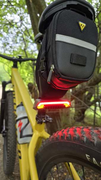 Zadní světlo Meilan X5 a podsedlová brašna Topeak AWP Large.