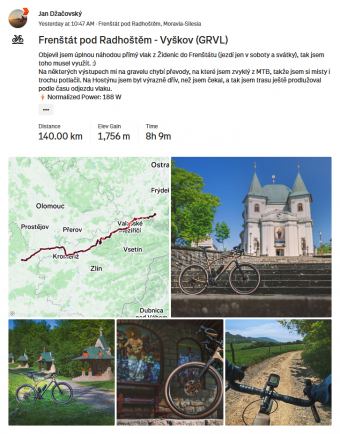 V původně plánovaném cíli (Hostýn) jsem byl výrazně dřív, než jsem čekal a to i přesto, že jsem se nevyhnul nějakému tlačení kola u prudších výstupů (holt mi na gravelu chybí lehké převody, na které jsem zvyklý u MTB), takže jsem tak trasu ještě prodlužoval podle času odjezdu vlaku nakonec až do Vyškova.