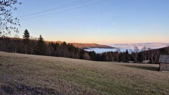 Mědník v dáli a mraky vyplňující údolí.