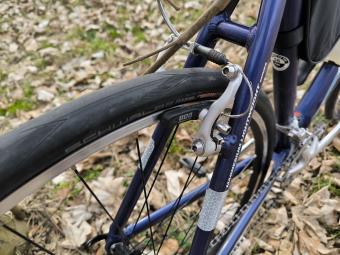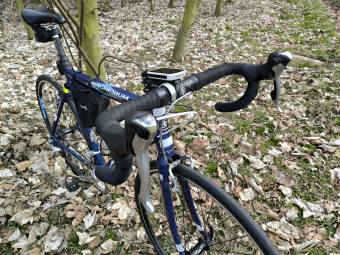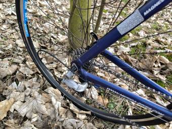 Hořčík zkraje milénia, vcelku lehký rám s pevnou Alu vidlí z doby, kdy se dělaly „fitness kola“. Hodil jsem si berany, průchodnost zadní stavby bídná, ale určení je na silnici. Chod mini-V s dualy je nic moc, ale nějak to funguje a brzdí, ale dlouhý krok na páce a malé otevření čelistí :-( 1placka 42 a kazeta „do Polabí“. Váha příjemně nízká – včetně pedálů a košíku. Geometrie celkem povedená a jelikož éra magnesia se už nebude opakovat, tak stále ve sbírce.