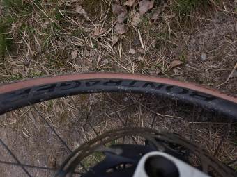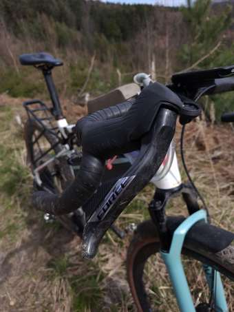 Brzdy SRAM Force současné generace - neskutečně povedená věc. Brzdit jde jedním prstem. Oproti minulé generaci (mám na jiném kole) obrovský posun dopředu.