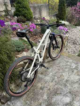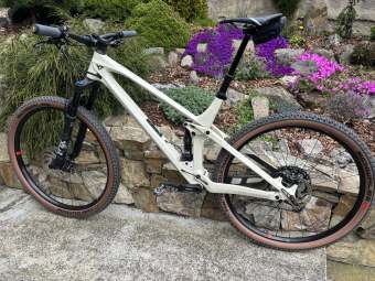 Bazarová rám.sada (rám, vidlice, tlumič a sedlovka), zbytek domácí zásoby. Lehce komponentově schizofrenní mix, ale funguje to:) Docela to jede za pedálem a z kopce to taky umí díky fajn geometrii. Dát tomu karbon kola, XT brzdy a jiné kliky, tak se to ještě posune, ale pro tuhle chvíli zatím nechám tak…
